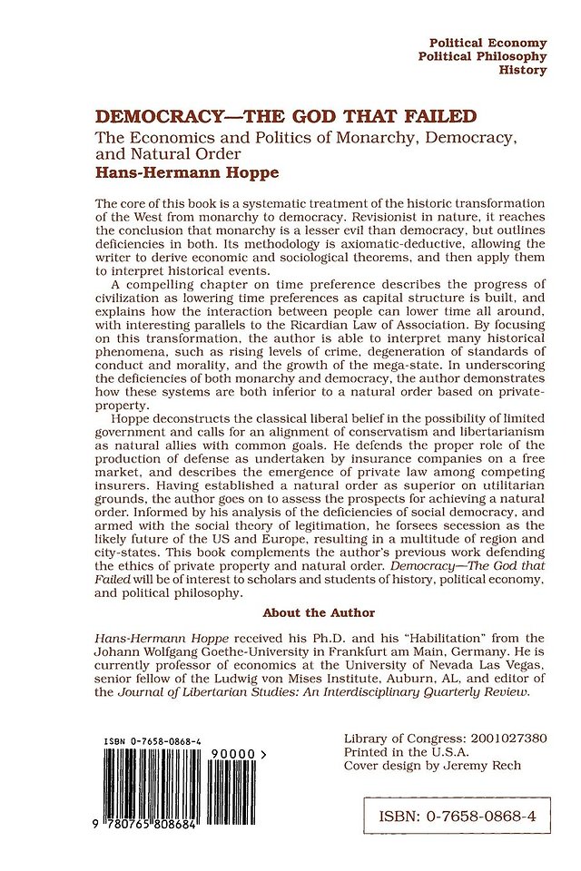 The core of this book is a systematic treatment of the historic transformation of the West from monarchy to democracy. Revisionist in nature, it reaches the conclusion that monarchy is a lesser evil than democracy, but outlines deficiencies in both. Its methodology is axiomatic-deductive, allowing the writer to derive economic and sociological theorems, and then apply them to interpret historical events.