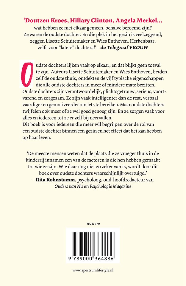 Oudste dochters: ze lijken vaak op elkaar, en dat blijkt geen toeval te zijn. Auteurs Lisette Schuitemaker en Wies Enthoven, beiden zelf de oudste thuis, ontdekten de vijf typische eigenschappen die alle oudste dochters in meer of mindere mate bezitten. Oudste dochters zijn verantwoordelijk, plichtsgetrouw, serieus, voortvarend en zorgzaam. Ze zijn vaak intelligenter dan de rest, verbaal vaardiger en gemotiveerder om iets te bereiken.