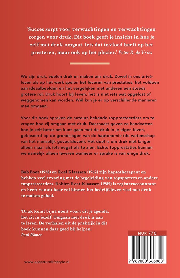 Hoe ga je om met al die vormen van druk als je op het toneel of op tv in de spotlights staat of die belangrijke wedstrijd hebt waar je al jaren voor traint? Voor dit boek spraken de auteurs bekende toppresteerders om te vragen hoe zij dat doen en geven op basis van de grondslagen van de haptonomie handvatten hoe je beter om kunt gaan met de druk in je eigen leven. Want of je het wilt of niet: druk ervaren hoort bij het leven. Ga het daarom niet uit de weg, maar leer ermee omgaan.