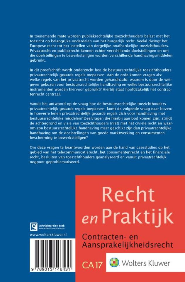 Steeds vaker worden publiekrechtelijke toezichthouders belast met toezicht op onderdelen van het burgerlijk recht. In hoeverre zijn beide rechtsgebieden verenigbaar? En is dat wenselijk in de praktijk? Deze uitgave werpt een blik op fundamentele en toegepaste kwesties.