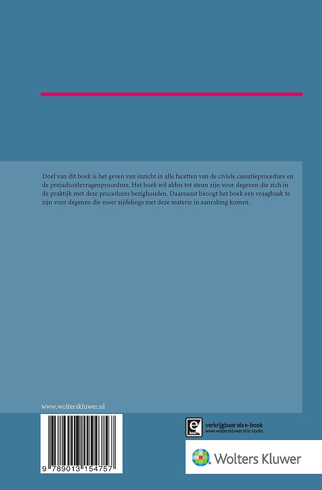 Deze titel biedt op toegankelijke wijze inzicht in alle facetten van de civiele cassatieprocedure en de prejudiciëlevragenprocedure. De auteurs schetsen een actueel en compleet beeld van deze materie. Zo vormt de uitgave een nuttig hulpmiddel in de gereedschapskist van iedere praktijkjurist.