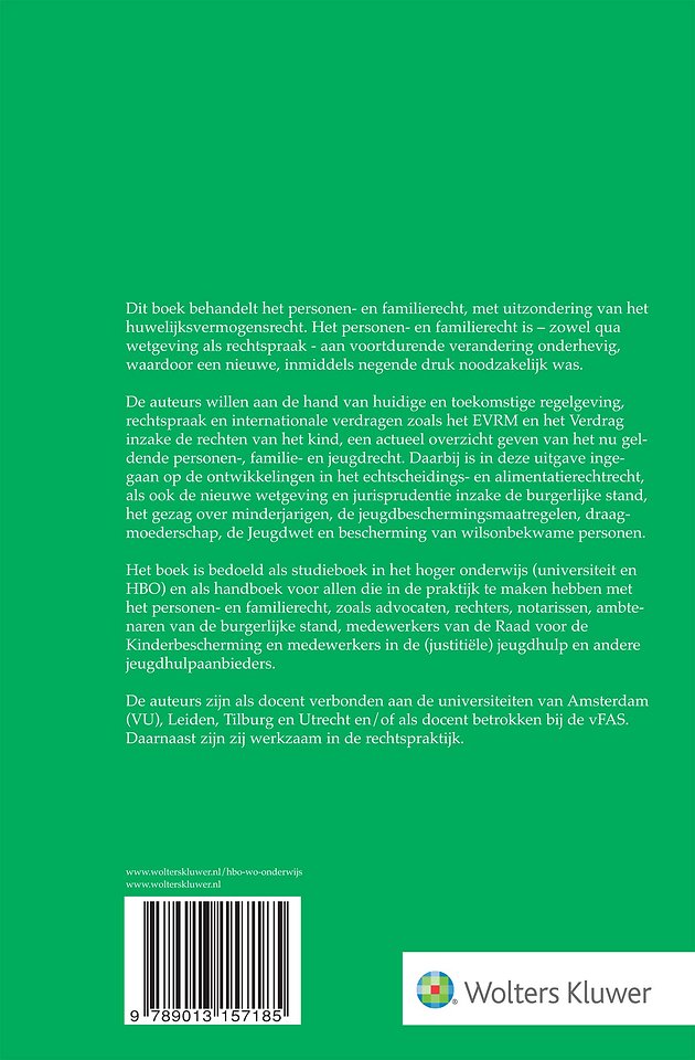 Het personen- en familierecht is voortdurend aan veranderingen onderhevig, zowel qua wetgeving als rechtspraak. Deze negende druk is in tal van opzichten bijgewerkt om recht te doen aan deze ontwikkelingen. Zo vindt u vanzelfsprekend de laatste rechtspraak op het terrein van het familie- en jeugdrecht, inclusief het procesrecht. Ook leest u over recente ontwikkelingen in onder meer het scheidings(proces)recht, het afstammings- en gezagsrecht en de (uitwerking van de) voorstellen van de Staatscommissie Herijking ouderschap.