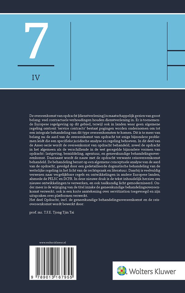 De overeenkomst van opdracht (dienstverlening) is maatschappelijk gezien van groot belang. Immers, veel contractuele verhoudingen houden dienstverlening in. In de 4e druk van Asser-deel 7-IV Opdracht, incl. de geneeskundige behandelingsovereenkomst en de reisovereenkomst wordt de overeenkomst van opdracht behandeld. De titel geldt als het voornaamste commentaar over de overeenkomst van opdracht en bijbehorende overeenkomsten. Het gaat hierbij zowel om de opdracht in het algemeen als de verschillende in de wet geregelde bijzondere vormen van opdracht: lastgeving, bemiddeling, agentuur, en geneeskundige behandelingsovereenkomst. Daarnaast wordt de nauw verwante reisovereenkomst behandeld.