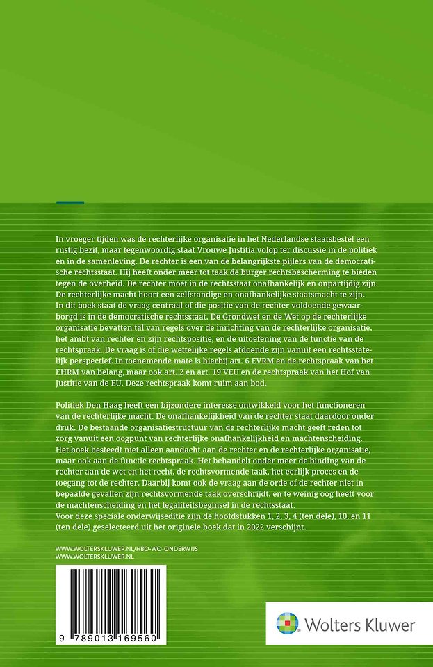 Is de rechterlijke macht een zelfstandige en gelijkwaardige staatsmacht naast de machten regering en parlement? Deze titel geeft inzicht in de inrichting van de rechterlijke organisatie, het ambt van rechter en de uitoefening van de functie van de rechtspraak. Diverse actuele vraagstukken komen aan de orde, net als een analyse van de (grond)wettelijke regelingen.