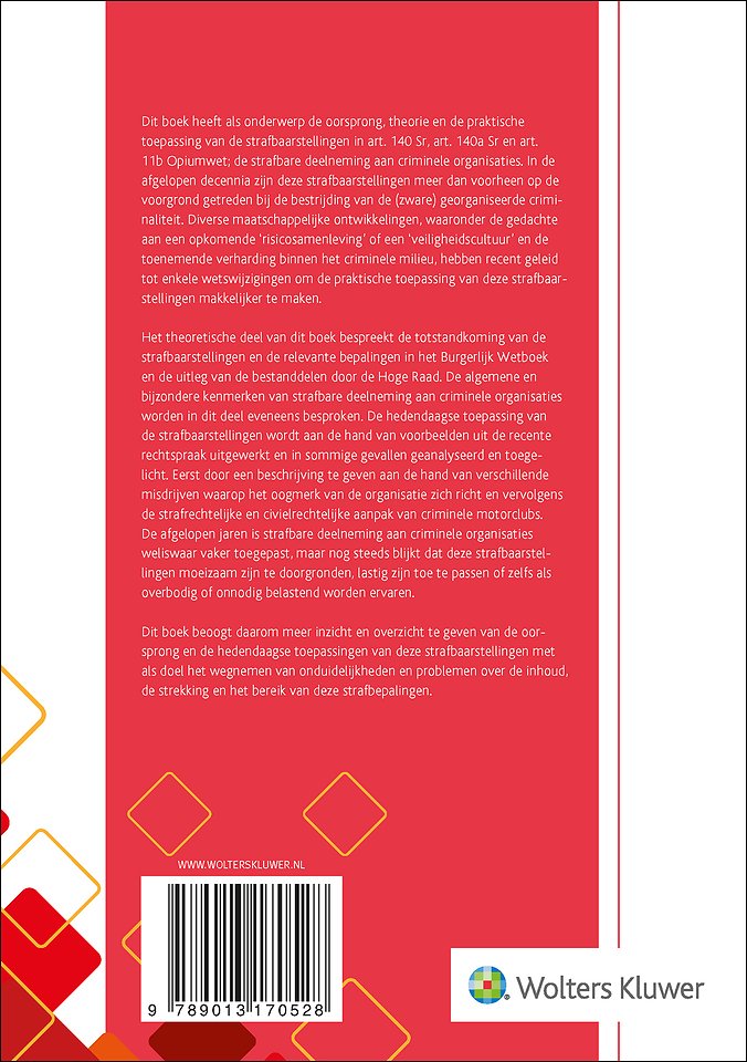 Strafbare deelneming aan criminele organisaties levert een volwaardig beeld van de oorsprong, theorie en de praktische toepassing van de strafbaarstellingen in art. 140 Sr, art. 140a Sr en art. 11b Opiumwet; de strafbare deelneming aan criminele organisaties. In de afgelopen decennia zijn deze strafbaarstellingen meer dan voorheen op de voorgrond getreden bij de bestrijding van de (zware) georganiseerde criminaliteit.