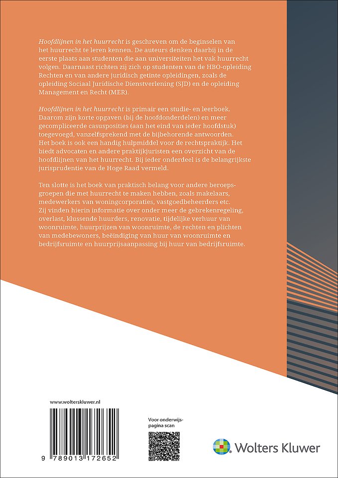 Uniek zijn de korte opgaven per onderdeel en de (meer gecompliceerde) casusposities die elk hoofdstuk afsluiten. Je kunt op die manier eenvoudig toetsen of je het onderdeel beheerst. Het HBO- en WO-onderwijs gebruikt het boek daarom graag als studieboek. Maar ook praktijkjuristen vallen er graag op terug als ze snel een huurrechtprobleem willen overzien.