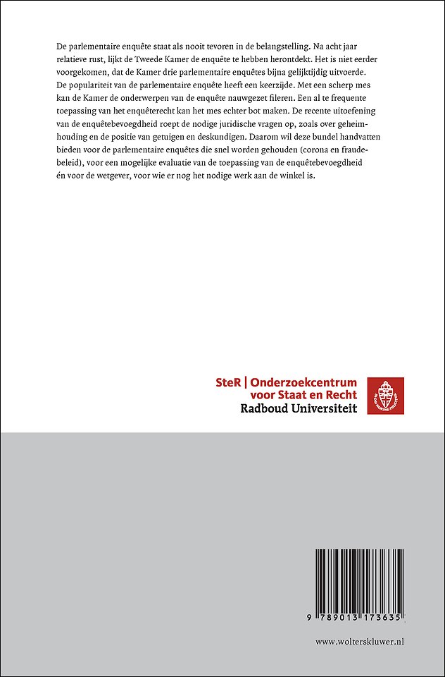 Deze bundel geeft inzicht in de actuele stand van zaken van het parlementaire enquêterecht. Juridische vragen over geheimhouding en de positie van getuigen en deskundigen staan centraal. Ook worden actuele onderwerpen als de Groningse gaswinning, Toeslagensystematiek en de coronapandemie besproken.