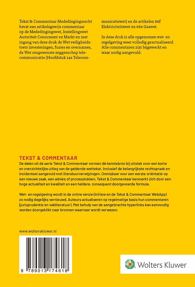 Tekst & Commentaar Mededingingsrecht vormt dé kennisbron bij uitstek voor een korte en overzichtelijke uitleg van de geldende wettekst. Biedt tevens de belangrijkste rechtspraak en waar nodig aangevuld met literatuurverwijzingen. Onmisbaar voor een eerste oriëntatie op een nieuwe zaak, een advies of processtukken. Gebruikers waarderen de serie vanwege de betrouwbaarheid en actualiteit. In combinatie met de online versie (InView) of WebApp is de actualiteit nog groter.
