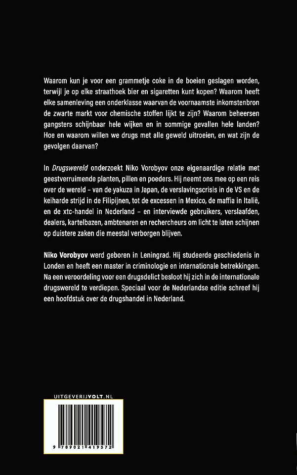 Niko Vorobyov kreeg een gevangenisstraf voor drugshandel en verdiepte zich toen hij vrijkwam in onze relatie met drugs. Hij beschrijft de fascinatie, de handel en de bestrijding en neemt ons mee op ontmoetingen met gebruikers, dealers, gangmembers en huurmoordenaars. We lezen over de yakuza in Japan, de keiharde strijd in de Filipijnen, de excessen in Mexico, de situatie in Zuid-Amerika, de maffia in Italië, de verslavingscrisis in de VS en de xtc-handel in Nederland. Niko Vorobyov laat licht schijnen op duistere zaken.