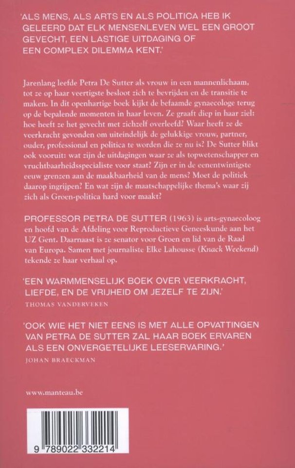 Jarenlang leefde Petra De Sutter als vrouw in een mannenlichaam, tot ze op haar veertigste besloot zich te bevrijden en de transitie te maken. In dit openhartige boek kijkt de befaamde gynaecologe terug op de bepalende momenten in haar leven. Ze graaft diep in haar ziel: hoe heeft ze het gevecht met zichzelf overleefd? Waar heeft ze de veerkracht gevonden om uiteindelijk de gelukkige vrouw, partner, ouder, professional en politica te worden die ze nu is? De Sutter blikt ook vooruit: wat zijn de uitdagingen waar ze als topwetenschapper en vruchtbaarheidsspecialiste voor staat? Zijn er in de eenentwintigste eeuw grenzen aan de maakbaarheid van de mens? Moet de politiek daarop ingrijpen? En wat zijn de maatschappelijke thema’s waar zij zich als Groen-politica hard voor maakt? Professor De Sutter (1963) is arts-gynaecoloog en hoofd van de Afdeling voor Reproductieve Geneeskunde aan het UZ Gent. Daarnaast is ze senator voor Groen en lid van de Raad van Europa. Samen met journaliste Elke Lahousse (Knack Weekend) tekende ze haar verhaal op.