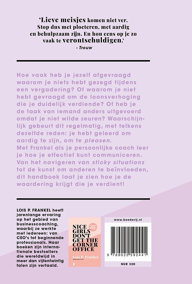 In dit gloednieuwe boek van Lois P. Frankel, auteur van de bestseller Nice girls don’t get the corner office, leer je hoe je op de meest effectieve manier kunt communiceren. Van de basis en het navigeren in sticky situations tot de kunst om anderen te beïnvloeden, dit handboek laat je met praktijkvoorbeelden en krachtige tools zien hoe je de zichtbaarheid en waardering krijgt die je verdient! Want een vrouw op de werkvloer is helaas nog steeds veel te vaak een nice girl.
