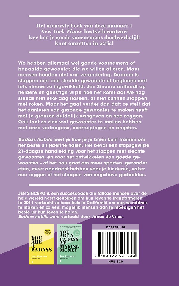 Jen Sincero ontleedt op heldere en geestige manier hoe het komt dat we nog steeds niet elke dag flossen of niet kunnen stoppen met roken. Maar het gaat verder dan dat: ze leert ook dat het aanleren van gezonde gewoonten te maken heeft met je grenzen duidelijk aangeven en nee zeggen. En ze laat zien wat gewoonten te maken hebben met onze verlangens, onze overtuigingen en onze angsten.