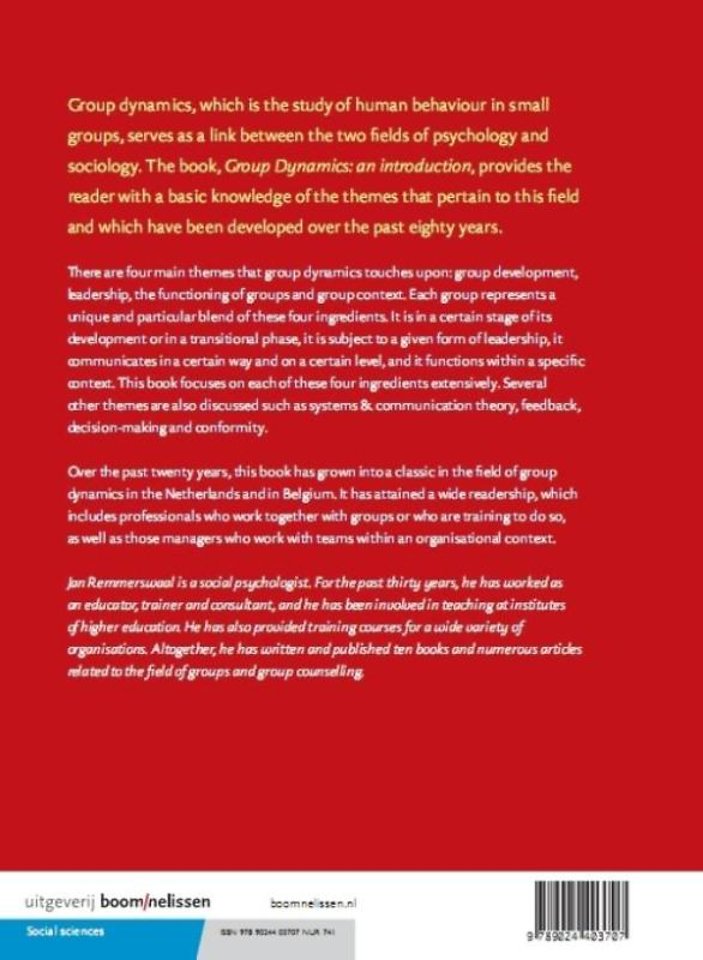Dit boek behandelt de hoofdthema's uit de groepsdynamica, waaronder niveaus en interventies in groepen, groepsvorming, feedback, besluitvorming, conformiteit en het functioneren van teams. In deze elfde herziene druk is er ruime aandacht voor twee centrale onderwerpen binnen het vakgebied: communicatie en leiderschap. Bij de behandeling van de thema's worden er op systematische wijze verbindingen gelegd met de praktijk. Op deze manier ontstaat een rijk overzicht van de groepsdynamica.