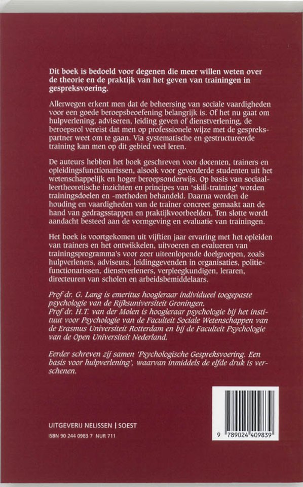 Dit boek is bedoeld voor diegenen die meer willen weten over de theorie en de praktijk van het geven van trainingen in gespreksvoering. Allerwegen erkent men dat de beheersing van sociale vaardigheden voor een goede beroepsbeoefening belangrijk is. Of het nu gaat om hulpverlening, adviseren, leiding geven of dienstverlening, de beroepsrol vereist dat men op professionele wijze met de gesprekspartner weet om te gaan. Via systematische en gestructureerde training kan men op dit gebied veel leren.