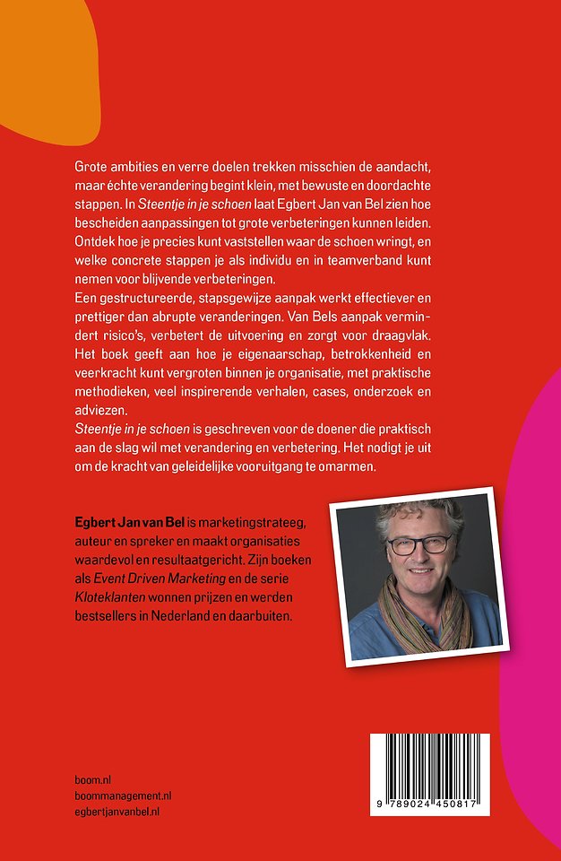 Meer over Egbert Jan van BelGrote ambities en verre doelen trekken misschien de aandacht, maar échte verandering begint klein, met bewuste en doordachte stappen. In 'Steentje in je schoen' laat Egbert Jan van Bel zien hoe bescheiden aanpassingen tot grote verbeteringen kunnen leiden. Ontdek hoe je precies kunt vaststellen waar de schoen wringt, en welke concrete stappen je als individu en in teamverband kunt nemen voor blijvende verbeteringen.