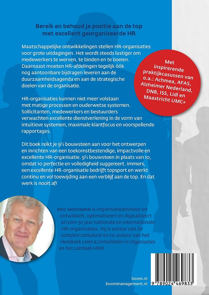 Dit boek reikt je 9 ½ bouwstenen aan voor het ontwerpen en inrichten van toekomstbestendige HR-organisaties. Mooijman onderscheidt 9 ½ bouwsteen in plaats van 10, omdat 10 perfectie en volledigheid suggereert. Een excellente HR-organisatie bedrijft topsport en werkt continu en vol toewijding aan een verblijf aan de top.
