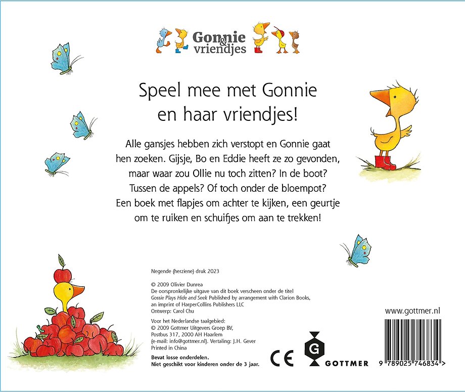 'Gonnie & vriendjes - Zoek en vind' is een heerlijk zoekboek bomvol flapjes, wieltjes, schuifjes en andere verrassingen. Alle gansjes hebben zich verstopt en Gonnie gaat hen zoeken. Gijsje, Bo en Eddie heeft ze zo gevonden, maar waar zou Ollie nu toch zitten? In de boot? Tussen de appels? Of toch onder de bloempot?