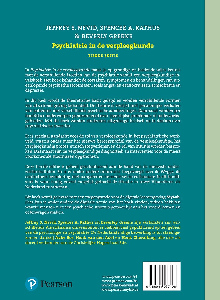 In Psychiatrie in de verpleegkunde maakt de student op grondige en boeiende wijze kennis met de verschillende facetten van de psychiatrie vanuit een verpleegkundige invalshoek. Het boek behandelt de oorzaken, symptomen en behandelingen van uiteenlopende psychische stoornissen, zoals angst- en eetstoornissen, schizofrenie en depressie.