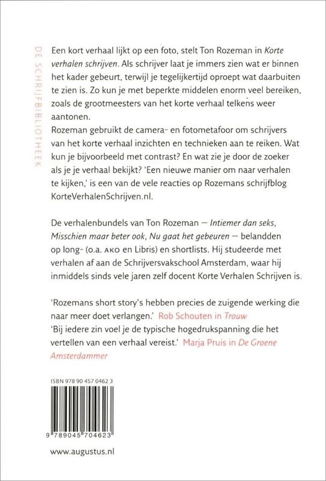 Een kort verhaal lijkt op een foto, beweert Ton Rozeman in Korte verhalen schrijven. Als schrijver laat je immers zien wat er binnen het kader gebeurt, terwijl je tegelijkertijd oproept wat daarbuiten te zien is. Zo kun je met beperkte middelen enorm veel bereiken, zoals de grootmeesters van het korte verhaal telkens weer aantonen.