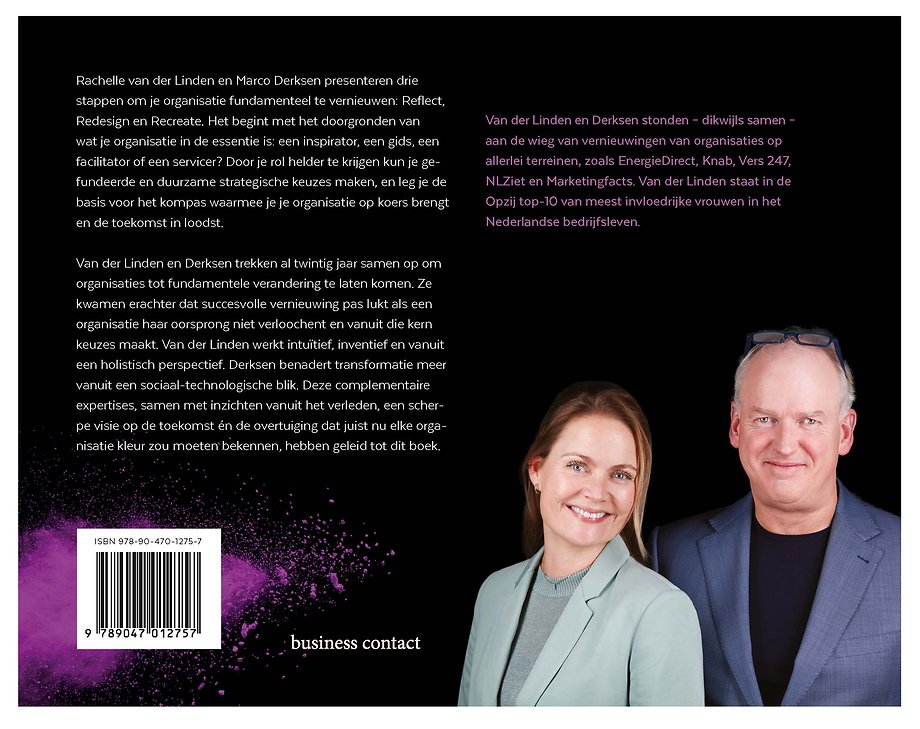 Van der Linden en Derksen trekken al twintig jaar samen op om organisaties tot fundamentele verandering te laten komen. Ze kwamen erachter dat succesvolle vernieuwing pas lukt als een organisatie haar oorsprong niet verloochent en vanuit die kern keuzes maakt. Van der Linden werkt intuïtief, inventief en vanuit een holistisch perspectief. Derksen benadert transformatie meer vanuit een sociaal-technologische blik. Deze complementaire expertises, samen met inzichten vanuit het verleden, een scherpe visie op de toekomst én de overtuiging dat juist nu elke organisatie kleur zou moeten bekennen, hebben geleid tot dit boek.
