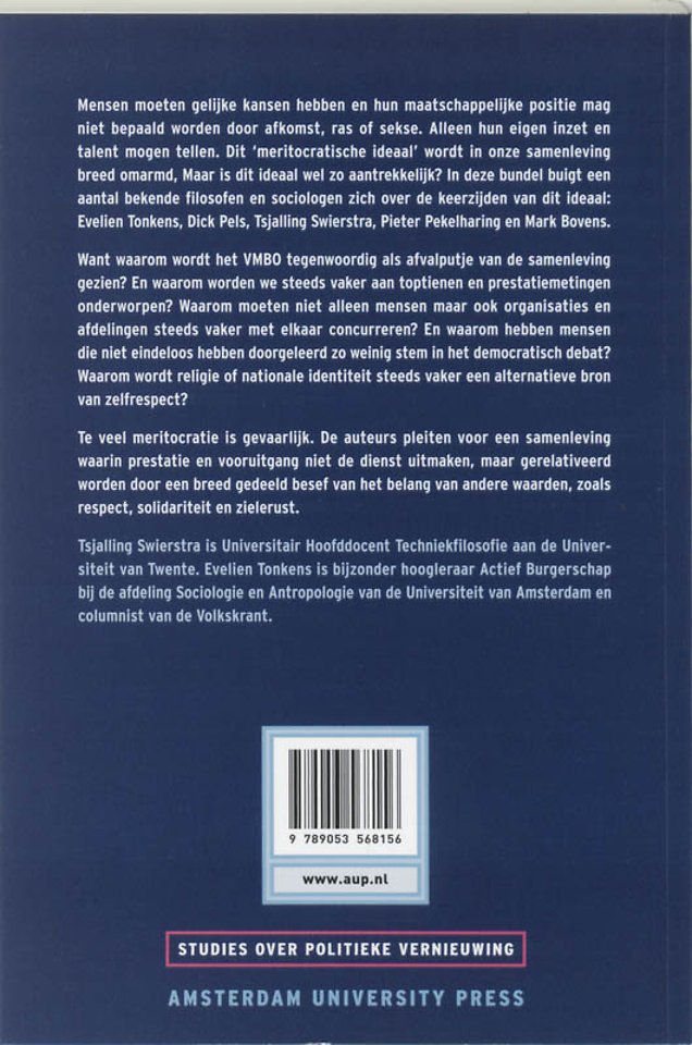 Evelien Tonkens, Dick Pels, Pieter Pekelharing, Mark Bovens en Tsjalling Swierstra laten zien dat het meritocratische ideaal op gespannen voet staat met andere belangrijke idealen als onderling respect, solidariteit, democratie, onderhoud en een ontspannen samenleving.