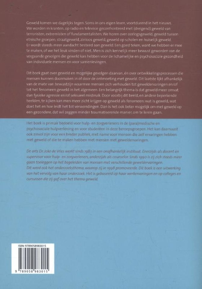 De arts Dr. Joke de Vries werkt sinds 1983 in een onafhankelijk instituut. Enerzijds als docent en supervisor voor hulp- en zorgverleners, anderzijds als counselor. Sinds 1990 is zij zich steeds meer gaan toeleggen op het begeleiden van mensen met verschillende geweldervaringen. Dit werd ook het onderzoeksthema, waarop zij in 1998 promoveerde. Dit boek is een uitwerking van het vervolg van haar onderzoek. Het is gebaseerd op haar werkervaringen en op colleges en cursussen die zij gaf over het thema geweld.