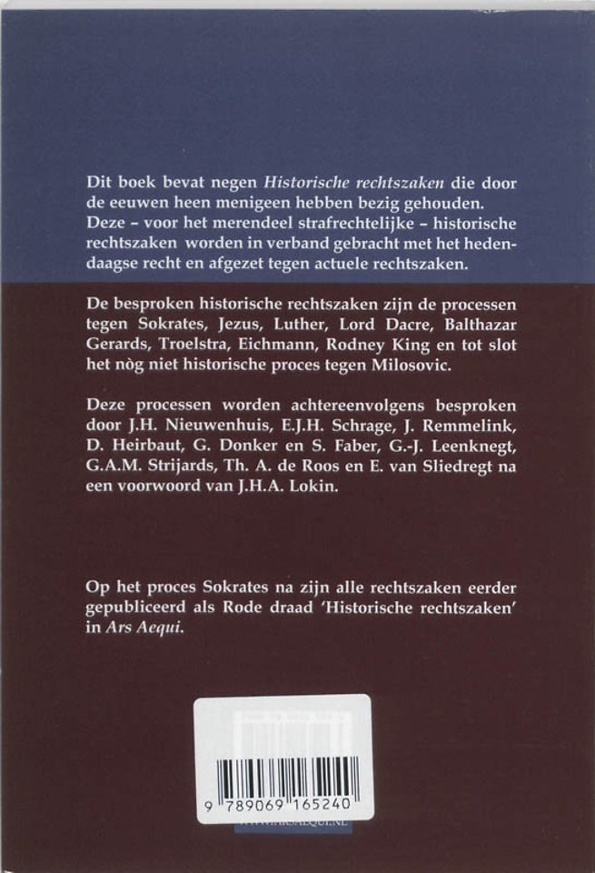 Dit boek bevat negen 'Historische rechtszaken' die door de eeuwen heen menigeen hebben bezig gehouden. Deze - voor het merendeel strafrechtelijke historische rechtszaken worden in verband gebracht met het hedendaagse recht en afgezet tegen actuele rechtszaken. De besproken historische rechtszaken zijn de processen tegen Sokrates, Jezus, Luther, Lord Dacre, Balthazar Gerards, Troelstra, Eichmann, Rodney King en tot slot het nóg niet historische proces tegen Milosovic. Deze processen worden achtereenvolgens besproken door J.H. Nieuwenhuis, E.J.H. Schrage, J. Remmelink, D. Heirbaut, G. Donker en S. Faber, G.-J. Leenknegt, G.A.M. Strijards, Th.A. de Roos en E. van Sliedregt na een voorwoord van J.H.A. Lokin.