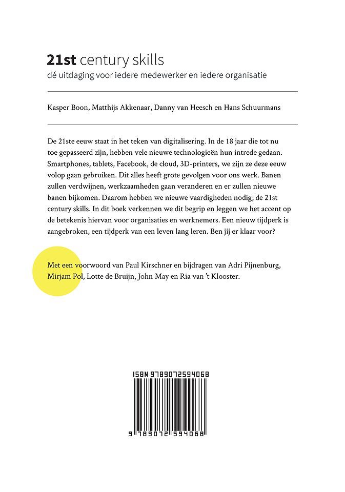 Banen zullen verdwijnen, werkzaamheden gaan veranderen en er zullen nieuwe banen bijkomen. Daarom hebben we nieuwe vaardigheden nodig; de 21st century skills. In dit boek verkennen we dit begrip en leggen we het accent op de betekenis hiervan voor organisaties en werknemers. Een nieuw tijdperk is aangebroken, een tijdperk van een leven lang leren. Ben jij er klaar voor?