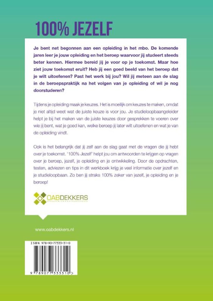 Ook is het belangrijk dat jij zelf aan de slag gaat met de vragen die jij hebt over je toekomst. '100% Jezelf' helpt jou om antwoorden te krijgen op vragen over je beroep, jezelf, je opleiding en je ontwikkeling. Door de opdrachten, testen, adviezen en tips in dit werkboek krijg je veel informatie over jezelf en je studieloopbaan. Zo ben jij straks 100% zeker van jezelf, je opleiding en je beroep!