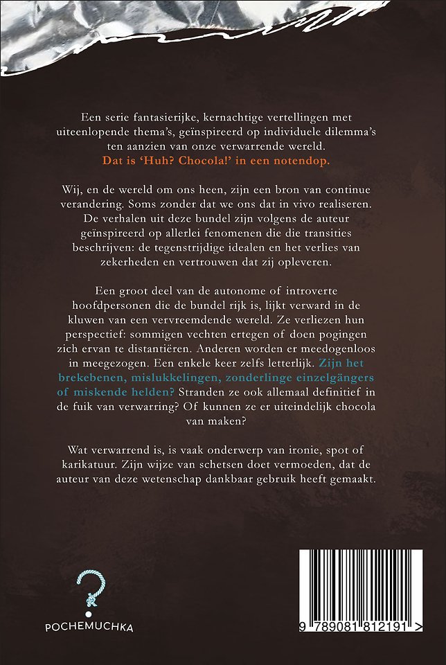 Een serie fantasierijke, kernachtige vertellingen met uiteenlopende thema’s, geïnspireerd op individuele dilemma’s ten aanzien van onze verwarrende wereld. Dat is ‘Huh? Chocola!’ in een notendop.