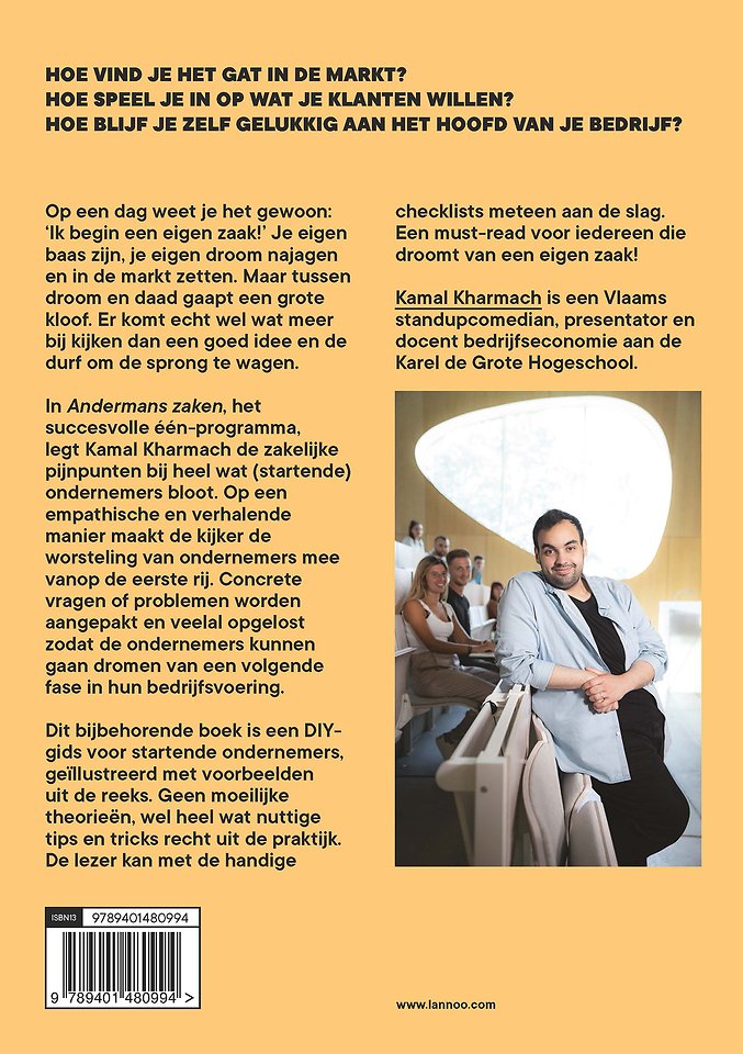 In Andermans zaken, het succesvolle één-programma, legt Kamal Kharmach de zakelijke pijnpunten bij heel wat (startende) ondernemers bloot. Op een empathische en verhalende manier maakt de kijker de worsteling van ondernemers mee vanop de eerste rij. Concrete vragen of problemen worden aangepakt en veelal opgelost zodat de ondernemers kunnen gaan dromen van een volgende fase in hun bedrijfsvoering.