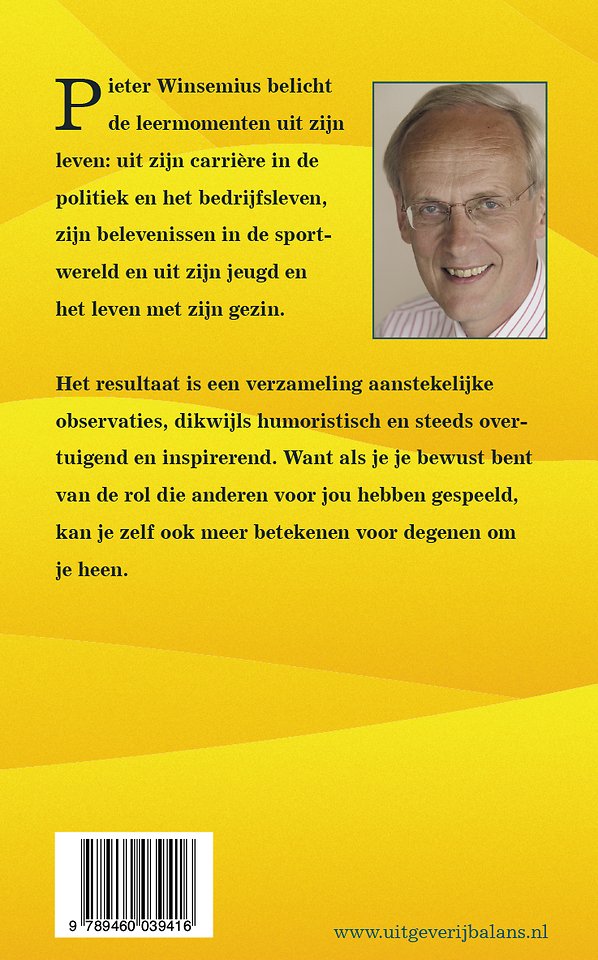 Pieter Winsemius dook in zijn geheugen om de leermomenten uit zijn bestaan te belichten: uit zijn sportambities, carrière in de politiek en het bedrijfsleven, maar ook uit het leven met zijn gezin. Het resultaat is een verzameling aanstekelijke observaties, dikwijls humoristisch, en steeds overtuigend en inspirerend. Want als je je bewust bent van de rol die anderen voor jou hebben gespeeld, kan je zelf ook meer betekenen voor degenen om je heen.