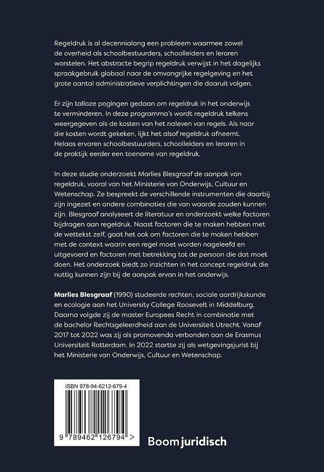 In deze studie onderzoekt Marlies Blesgraaf de aanpak van regeldruk, vooral van het Ministerie van Onderwijs, Cultuur en Wetenschap. Ze bespreekt de verschillende instrumenten die daarbij zijn ingezet en andere combinaties die van waarde zouden kunnen zijn. Blesgraaf analyseert de literatuur en onderzoekt welke factoren bijdragen aan regeldruk. Naast factoren die te maken hebben met de wettekst zelf, gaat het ook om factoren die te maken hebben met de context waarin een regel moet worden nageleefd en uitgevoerd en factoren met betrekking tot de persoon die dat moet doen. Het onderzoek biedt zo inzichten in het concept regeldruk die nuttig kunnen zijn bij de aanpak ervan in het onderwijs.