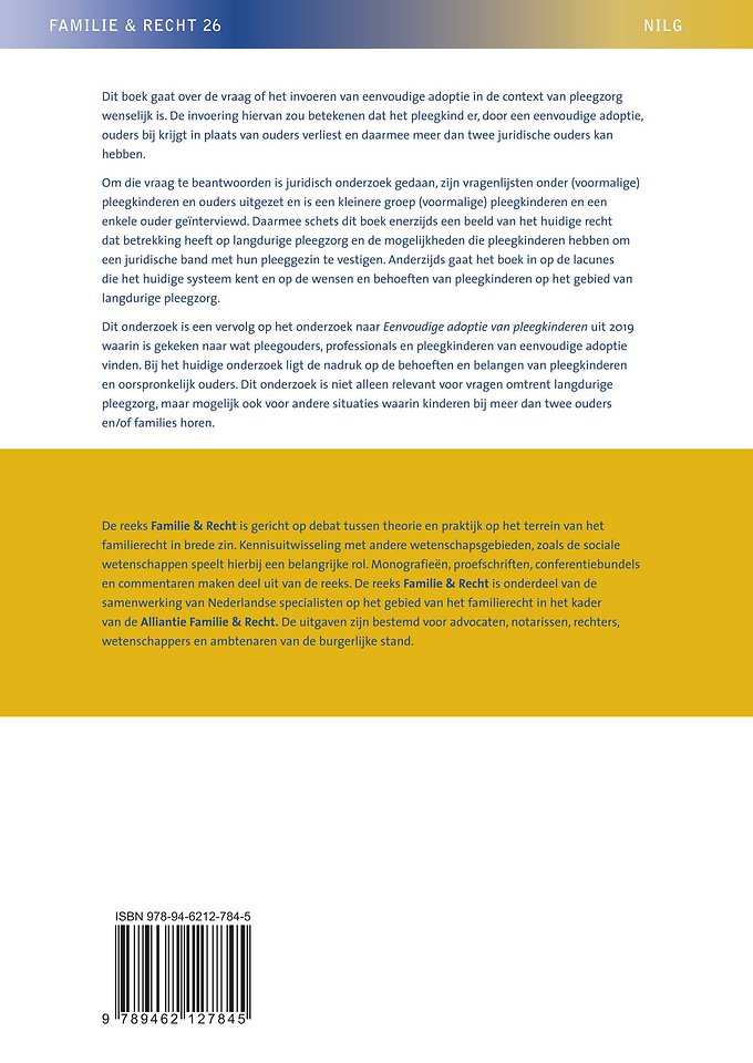 Om die vraag te beantwoorden is juridisch onderzoek gedaan, zijn vragenlijsten onder (voormalige) pleegkinderen en ouders uitgezet en is een kleinere groep (voormalige) pleegkinderen en een enkele ouder geïnterviewd. Daarmee schets dit boek enerzijds een beeld van het huidige recht dat betrekking heeft op langdurige pleegzorg en de mogelijkheden die pleegkinderen hebben om een juridische band met hun pleeggezin te vestigen. Anderzijds gaat het boek in op de lacunes die het huidige systeem kent en op de wensen en behoeften van pleegkinderen op het gebied van langdurige pleegzorg.