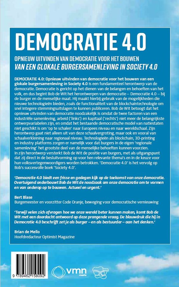 "Democratie 4.0 biedt een frisse en gedegen kijk op de toekomst van onze democratie. Overtuigend onderbouwt Bob de Wit de noodzaak om onze democratie om te vormen en van onderop op te bouwen. Actueel en urgent." - Bert Blase, Burgemeester en voorzitter Code Oranje, beweging voor democratische vernieuwing