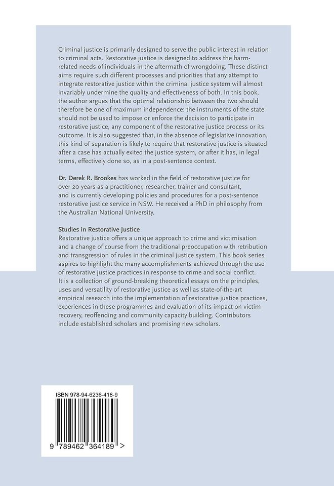 In this book, the author argues that the optimal relationship between the two should therefore be one of maximum independence: the instruments of the state should not be used to impose or enforce the decision to participate in restorative justice, any component of the restorative justice process or its outcome. It is also suggested that, in the absence of legislative innovation, this kind of separation is likely to require that restorative justice is situated after a case has actually exited the justice system, or after it has, in legal terms, effectively done so, as in a post-sentence context.