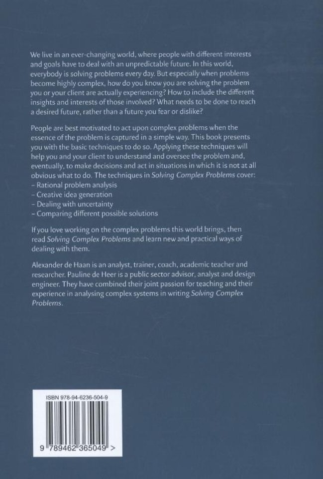 We live in an ever-changing world, where people with different interests and goals have to deal with an unpredictable future. In this world, everybody is solving problems every day. But especially when problems become highly complex, how do you know you are solving the problem you or your client are actually experiencing? How to include the different insights and interests of those involved? What needs to be done to reach a desired future, rather than a future you fear or dislike? People are best motivated to act upon complex problems when the essence of the problem is captured in a simple way. This book presents you with the basic techniques to do so. Applying these techniques will help you and your client to understand and oversee the problem and, eventually, to make decisions and act in situations in which it is not at all obvious what to do. The techniques in Solving Complex Problems cover:- Rational problem analysis- Creative idea generation- Dealing with uncertainty- Comparing different possible solutionsIf you love working on the complex problems this world brings, then read this book and learn new and practical ways of dealing with them.