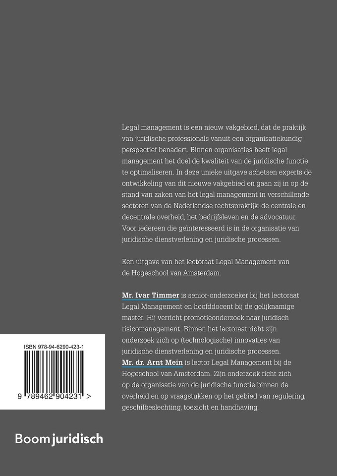 In deze unieke uitgave schetsen experts de ontwikkeling van dit nieuwe vakgebied en gaan zij in op de stand van zaken van het legal management in verschillende sectoren van de Nederlandse rechtspraktijk: de centrale en decentrale overheid, het bedrijfsleven en de advocatuur.