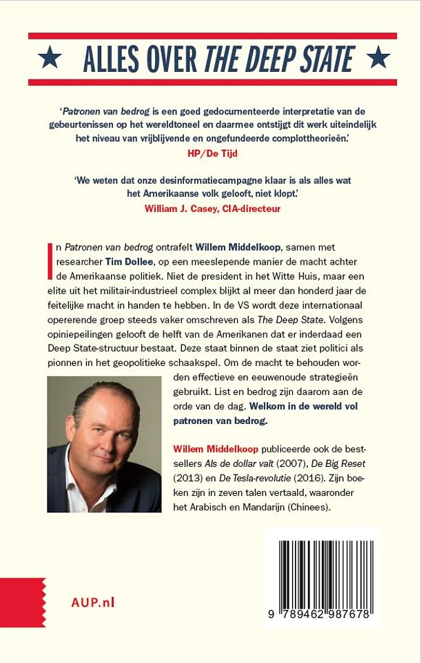 In 'Patronen van bedrog' ontrafelt Willem Middelkoop, samen met researcher Tim Dollee, op een meeslepende manier de macht achter de Amerikaanse politiek. Niet de president in het Witte Huis, maar een elite uit het militair-industrieel complex blijkt al meer dan honderd jaar de feitelijke macht in handen te hebben.