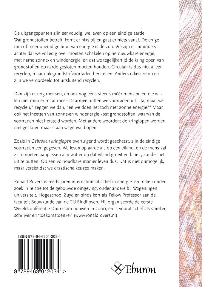 Zoals auteur Ronald Rovers in zijn boek 'Gebroken kringlopen' overtuigend laat zien, zijn de eindige voorraden een gegeven. We leven op aarde als op een eiland, en de mens zal zich moeten aanpassen aan wat er op dat eiland groeit en bloeit, zonder het uit te putten. Op een volhoudbare manier leven dus. Dat is niet onmogelijk, maar vereist dat we drastische keuzes maken.