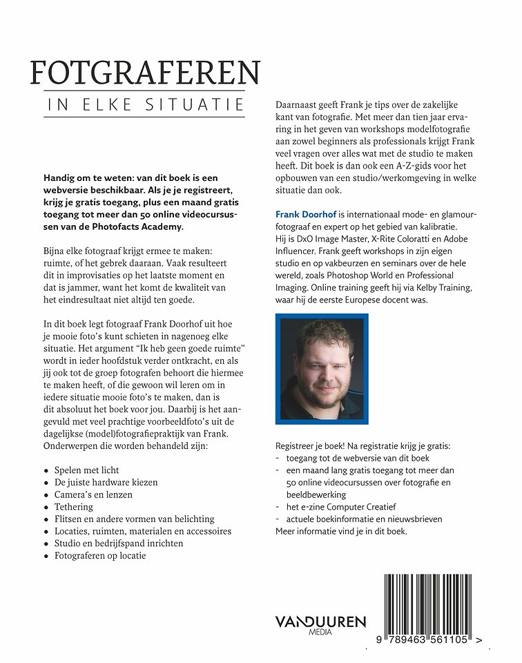 In dit boek legt fotograaf Frank Doorhof uit hoe je mooie foto’s kunt schieten in nagenoeg elke situatie. Het argument "Ik heb geen goede ruimte" wordt in ieder hoofdstuk verder ontkracht, en als jij ook tot de groep fotografen behoort die hiermee te maken heeft, of die gewoon wil leren om in iedere situatie mooie foto’s te maken, dan is dit absoluut het boek voor jou. Daarbij is het aangevuld met veel prachtige voorbeeldfoto’s uit de dagelijkse (model)fotografiepraktijk van Frank.