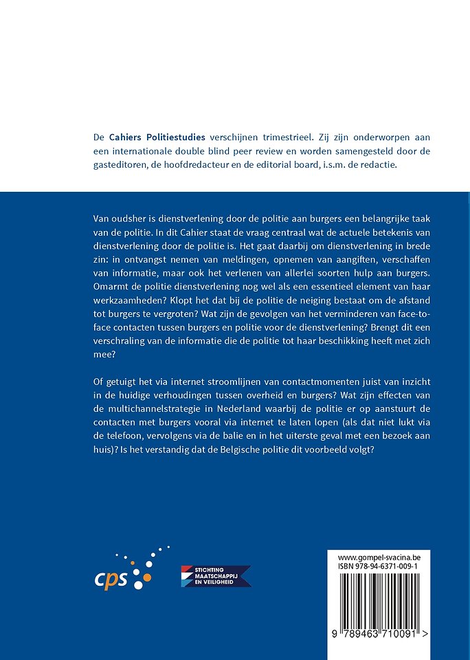 Dienstverlening door de politie aan burgers is van oudsher een belangrijke taak van de politie. In dit Cahier staat daarom de vraag centraal wat de actuele betekenis van dienstverlening door de politie is. Het gaat daarbij om dienstverlening in brede zin, namelijk: in ontvangst nemen van meldingen, opnemen van aangiften, verschaffen van informatie.