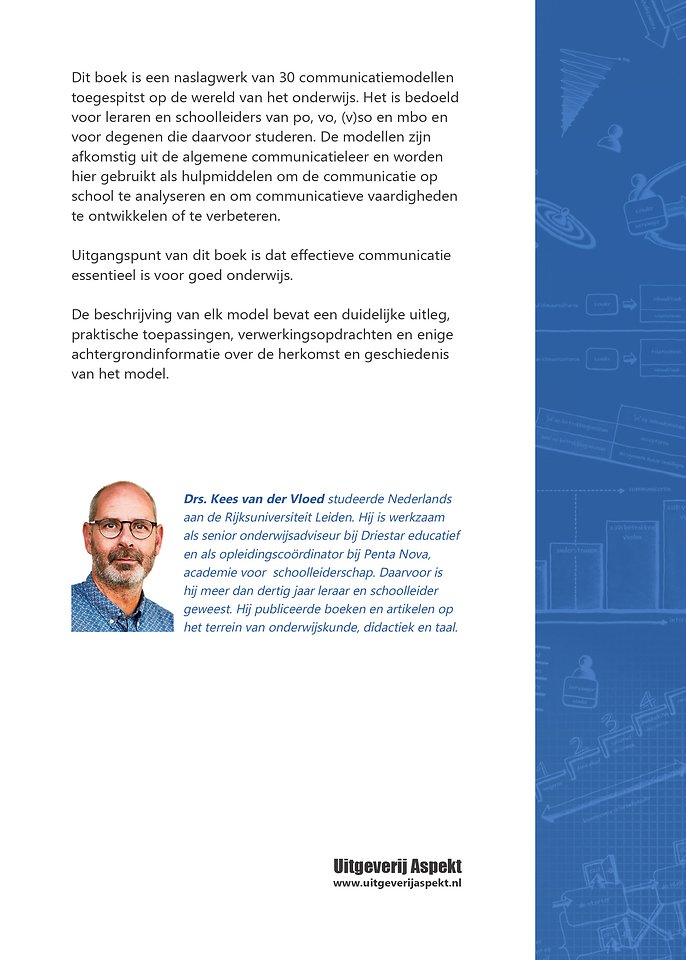 Dit boek is een naslagwerk van 30 communicatiemodellen toegespitst op de wereld van het onderwijs. Het is bedoeld voor leraren en schoolleiders van po, vo, (v)so en mbo en voor degenen die daarvoor studeren. De modellen zijn afkomstig uit de algemene communicatieleer en worden hier gebruikt als hulpmiddelen om de communicatie op school te analyseren en om communicatieve vaardigheden