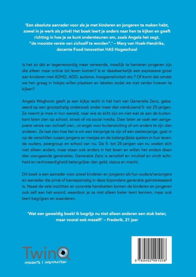 Angela Weghorst geeft je een kijkje recht in het hart van Generatie Zenz, gebaseerd op een grootschalig onderzoek onder meer dan vierduizend 5- tot 25-jarigen. Ze neemt je mee in hun wereld, naar wie ze écht zijn en niet wat ze aan de buitenkant laten zien op school, straat of via social media. Daar laten ze vaak een aangepaste versie van zichzelf zien, uit angst voor buitensluiting of om anders te zijn dan anderen. Ze laat zien hoe het is om een tienjarige te zijn of een zestienjarige, gaat in op de verschillen tussen jongens en meisjes en de belangrijkste spelers in hun leven: de ouders, peergroup en school van nu. De 5- tot 25-jarigen van nu voelen zich niet alleen anders, maar staan ook anders in het leven en willen het anders doen dan voorgaande generaties. Generatie Zenz is sensitief en intuïtief en vindt echtheid en rechtvaardigheid belangrijker dan geld, status en macht.