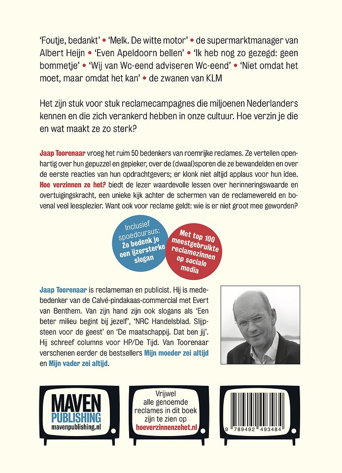 Reclamemeester Jaap Toorenaar vroeg het ruim 50 bedenkers van roemrijke reclames. Ze vertellen openhartig over hun gepuzzel en gepieker, over de (dwaal)sporen die ze bewandelden en over de eerste reacties van hun opdrachtgevers; er klonk niet altijd applaus voor hun idee. Daarnaast geeft Toorenaar een spoedcursus 'Hoe bedenk je een ijzersterke slogan', bespreekt hij de bekendste reclamemelodieën en onthult hij de top 100 van meestgebruikte reclamezinnen op social media.