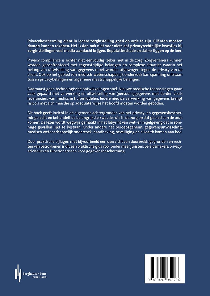 Dit boek geeft inzicht in de algemene achtergronden van het privacy- en gegevensbeschermingsrecht en behandelt de belangrijkste kwesties die in de zorg op dat gebied aan de orde komen. De lezer wordt wegwijs gemaakt in het labyrint van wet- en regelgeving dat in sommige gevallen lijkt te bestaan. Onder andere het beroepsgeheim, gegevensuitwisseling, medisch wetenschappelijk onderzoek, handhaving, beveiliging en eHealth komen aan bod.