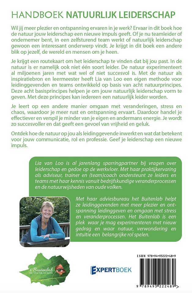 Je krijgt een routekaart om het leiderschap te vinden dat bij jou past. In de natuur is er namelijk ook niet één soort leider. De natuur experimenteert al miljoenen jaren met wat wel of niet succesvol is. Met de natuur als inspiratiebron en leermeester heeft Lia van Loo een eigen methode voor leidinggevenden en teams ontwikkeld op basis van acht natuurprincipes. Deze acht basisprincipes helpen je om jouw natuurlijk leiderschap vorm te geven. Met deze principes kan iedereen een natuurlijk leider worden.