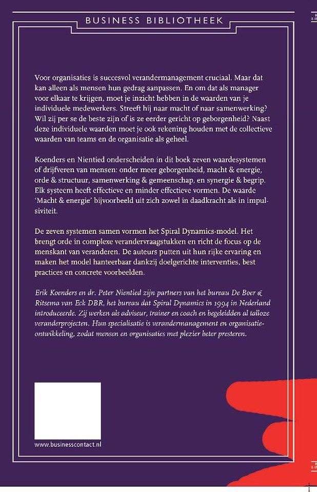 De zeven systemen samen vormen het Spiral Dynamics-model. Het brengt orde in complexe verandervraagstukken en richt de focus op de menskant van veranderen. De auteurs putten uit hun rijke ervaring en maken het model hanteerbaar dankzij doelgerichte interventies, best practices en concrete voorbeelden.