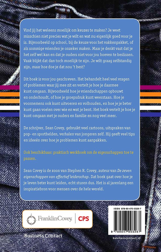 Vind jij het wel eens moeilijk om keuzes te maken? Bijvoorbeeld op school, bij de keuze voor het vakkenpakket, of als sommige vrienden je onzeker maken. Maar je weet dat je het zelf wel kan en dat je ouders niet voor jou hoeven te beslissen. Vaak blijkt dat dan toch moeilijk te zijn. Je wilt graag zelfstandig zijn, maar hoe doe je dat nou 't best? Sean Covey, zoon van Stephen Covey, kent deze problemen; de oplossingen beschreef hij in 'Zeven eigenschappen die jou succesvol maken!'